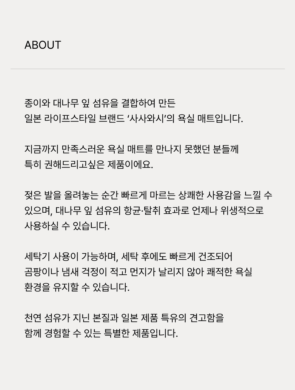 먼지 없는 쾌적함과 위생적인 사사와시 욕실 매트의 사용감을 느껴보세요.